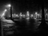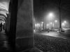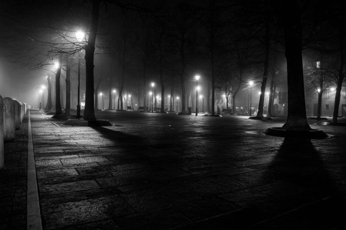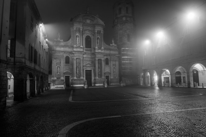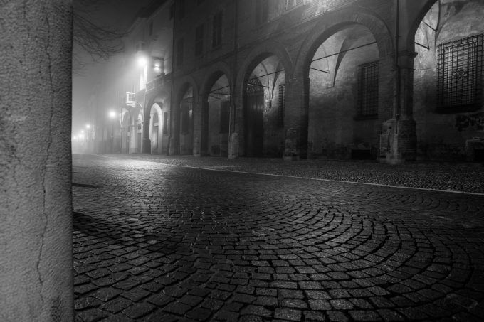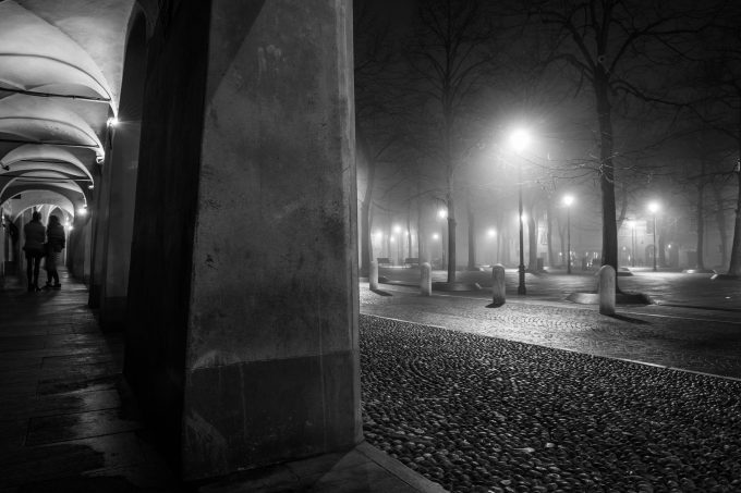 La notte reggiana, nel cuore della città così come in periferia , spesso veste un abito fatto di nebbia. Gli edifici, le piazze, gli alberi e le vie illuminati dai lampioni, tessono un gioco di luci e soprattutto di ombre che nascondono o lasciano intravedere tracce umane. Scorci cittadini, così diversi alla luce del sole, vengono narrati descritti e reinventati dal fotografo, nello spettacolo della vita reale con fantasiose immagini nuove.