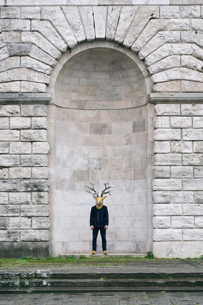 Alberi, foglie e rami secchi fanno da cornice ad uno scenario onirico/contemporaneo in cui si rinasce metà uomini e metà animali. In questo lungo viaggio interiore, mi piace immaginare un uomo libero che vaga e sogna tra la folla ed il caos della vita quotidiana. Un uomo che indossa tante maschere giocando con il proprio “io” e spazia tra pensieri leggeri di una realtà sospesa. Un uomo capace ancora di sognare. Con sentimento limpido, libera la parte più istinti- va e rinnova la sua promessa alla vita, come le corna del cervo rinascono stagione dopo stagione, innalzandosi verso l’alto fino a toccare la luce, così anche l’uomo si lascia andare in una poetica visione delle cose, in cui non si è più governati dalla paura e dall’odio, ma dalla purezza e bellezza dell’essere.