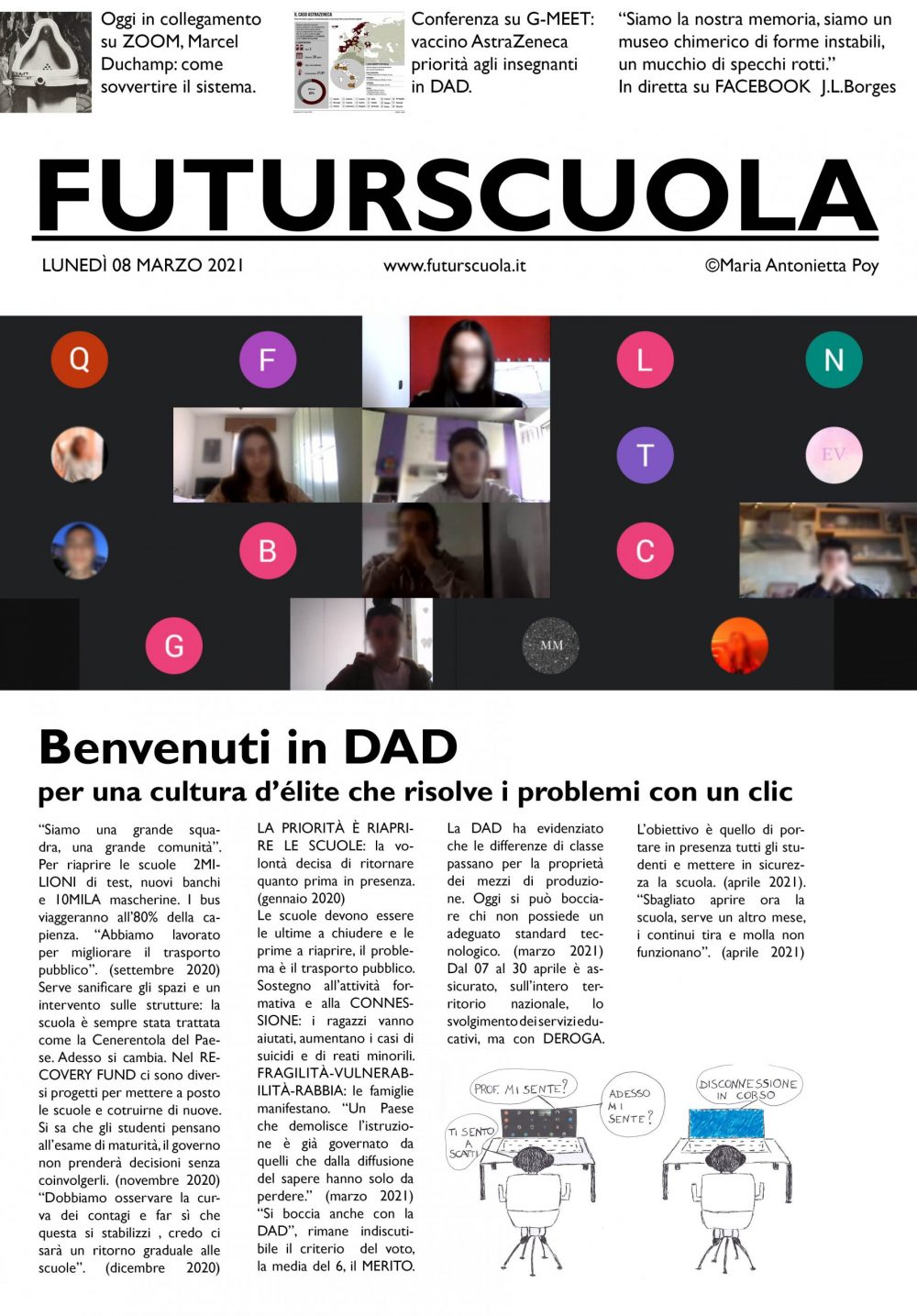 Prima pagina di un quotidiano di pura invenzione firmato SCUOLA. L’interesse primario, come i politici da giugno 2020 ad oggi continuano a ripetere, è la scuola in ogni suo aspetto. Abbandonata da anni da tagli drastici, ora nel momento pandemico si sentono tutti. Le infinite frasi dette, scritte e le false promesse, non hanno portato ad alcun fatto concreto. Siamo ancora in DAD e in DAD resteremo a lungo, è stata scelta la via più breve, la più semplice, senza alcun investimento sull’istruzione, la sicurezza e il trasporto pubblico. Il quotidiano ha un carattere ironico giocato tra realtà e finzione.